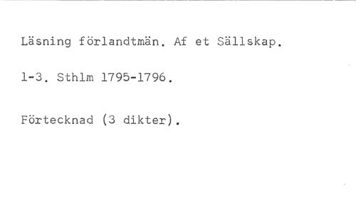 Läsning förlandtmän. Af et Sällskap. 1-3. Sthlm 1795-1796. //// Förtecknad (3 dikter).