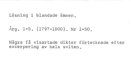 Läsning i blandade ämnen. //// Årg. 1-5. (1797-1800). Nr 1-50. //// Några få visartade dikter förtecknade efter excerpering av hela sviten.