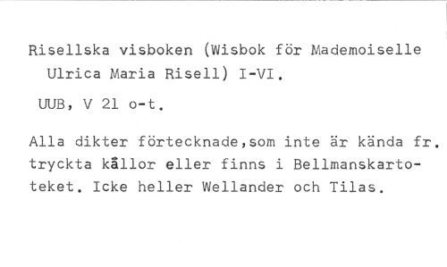 Risellska visboken (Wisbok för Mademoiselle Ulrica Maria Risell) I-VI. //// UUB, V 21 o-t. //// Alla dikter förtecknade,som inte är kända fr. tryckta kållor eller finns i Bellmanskartoteket. Icke heller Wellander och Tilas.