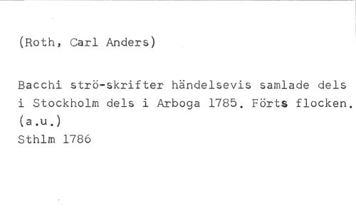 (Roth,. Carl Anders) //// Bacchi strö-skrifter händelsevis samlade dels i Stockholm dels i Arboga 1785. Förts flocken. (a.u.) //// Sthlm 1786