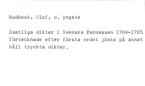 Rudbeck, Olof, d. yngste //// Samtliga dikter i Svenska Parnassen 1784-1785 förtecknade efter första ordet jämte på annat håll tryckta dikter.