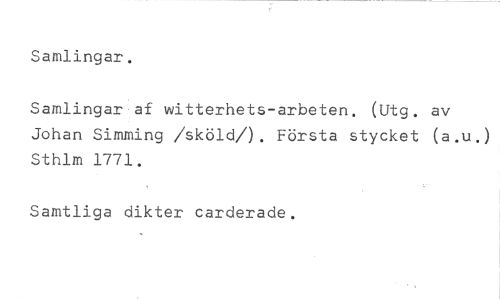 Samlingar. //// Samlingar af witterhets-arbeten. (Utg. av Johan Simming /sköld/). Första stycket (a.u.) Sthlm 1771. //// Samtliga dikter carderade.