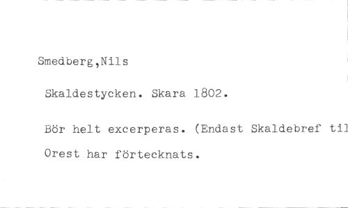 Smedberg,Nils //// Skaldestycken. Skara 1802. //// Bör helt excerperas. (Endast Skaldebref til Orest har förtecknats.