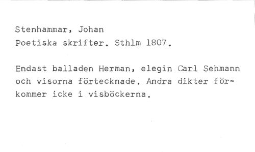 Stenhammar, Johan //// Poetiska skrifter. Sthlm 1807. //// Endast balladen Herman, elegin Carl Sehmann och visorna förtecknade. Andra dikter förkommer icke i visböckerna.