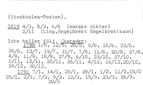 (Stockholms-Posten). //// 1819 4/3, 5/3, 6/8 (norska dikter) //// 2/11 (Ling,Engelbrekt Engelbrektsson) //// Icke hellerfölj. Charader: //// 1790 1/5, 12/5, 25/5, 9/6, 18/6, 22/6, //// 30/6, 12/7, 19/7, 31/7, 7/8, 11/8, 20/8, 27/8, 4/9, 11/9, 18/9, 27/9, 6/10, 23/10, 27/10, 1/11, 12/11, 20/11, 26/11, 4/12, 16/12,20/12, 24/12, 30/12. //// 1791 7/1, 14/1, 20/1, 28/1, 1/2, 11/2,15/2 //// 25/2, 2/3, 7/3, 9/3, 12/3, 15/3, 21/3, 26/3, 30/3