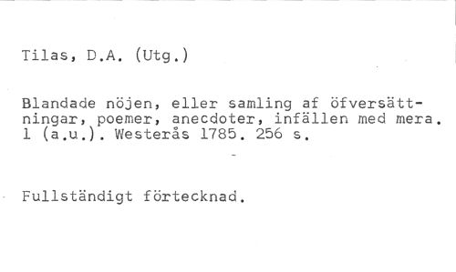 Tilas, D.A. (Utg.) //// Blandade nöjen, eller samling af öfversättningar, poemer, anecdoter, infällen med mera. 1 (a.u.). Westerås 1785. 256 s. //// Fullständigt förtecknad.