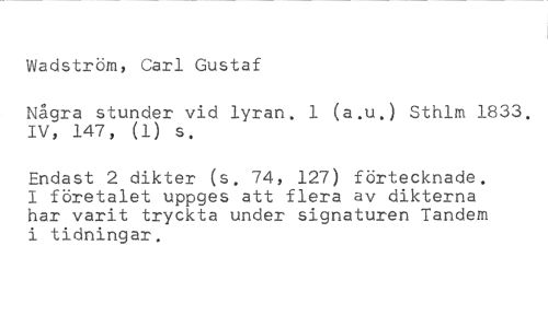 Wadström, Carl Gustaf //// Några stunder vid lyran. 1 (a.uj Sthlm 1833, IV, 147, (1) s. //// Endast 2 dikter (s. 74, 127) förtecknade. I företalet uppges att flera av dikterna har varit tryckta under signaturen Tandem i tidningar.
