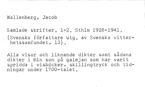 Wallenberg, Jacob //// Samlade skrifter. 1-2. Sthlm 1928-1941. //// (Svenska författare utg. av Svenska vitterhetssamfundet, 13). //// Alla visor och liknande dikter samt sådana dikter i Min son på galejan som har varit spridda i visböcker, skillingtryck och tidningar under 1700-talet.