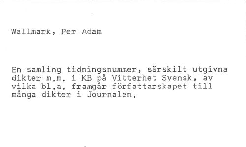 Wallmark, Per Adam //// En samling tidningsnummer, särskilt utgivna dikter m.m. i KB på Vitterhet Svensk, av vilka bl.a. framgår författarskapet till många dikter i Journalen.