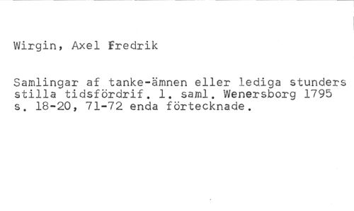 Wirgin, Axel Fredrik //// Samlingar af tanke-ämnen eller lediga stunders stilla tidsfördrif. 1. samt. Wenersborg 1795 s. 18-20, 71-72 enda förtecknade.