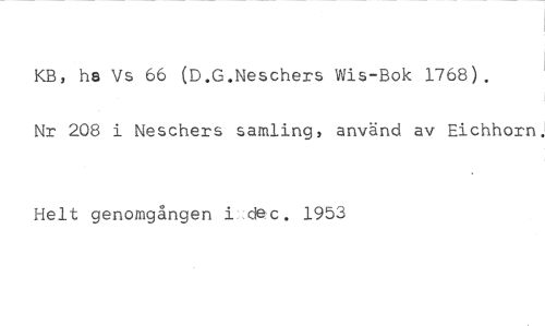 KB, hs Vs 66 (D.G.Neschers Wis-Bok 1768). //// Nr 208 i Neschers samling, använd av Eichhorn. //// Helt genomgången i dec. 1953