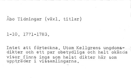Åbo Tidningar (växl. titlar) //// 1-10. 1771-1783. //// Intet att förteckna. Utom Kellgrens ungdoms-_ dikter och ett par obetydliga och helt okända //// visor finns inga som helst dikter här som uppträder i vissamlingarna.