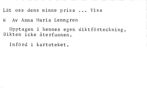 Lät oss dens minne prisa ... Visa W Av Anna Maria Lenngren //// Upptagen i hennes egen diktförteckning. Dikten icke återfunnen. //// Införd i kartoteket.