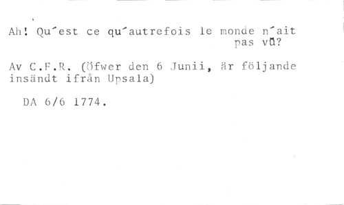 est ce qu'autrefois le monde n'ait //// pas vtt? //// Av C.F.R. (ifwer den 6 Junii, är följande insändt ifrån'Upsala) //// DA 6/6 1774.