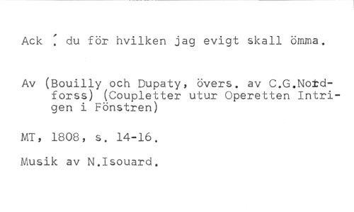 Ack ' du för hvilken jag evigt skall ömma. //// Av (Bouilly och Dupaty, övers, av C.G.Notdforss) (Coupletter utur Operetten Intrigen i Fönstren) //// MT, 1808, s. 14-16. Musik av N.Isouard.