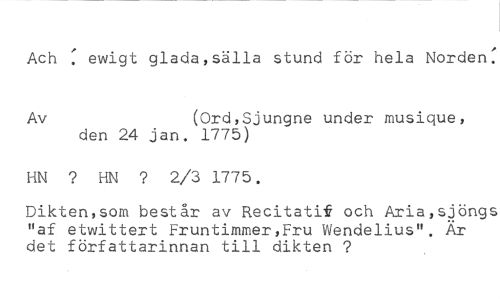 Ach ewigt glada,sälla stund för hela Norden: //// Av (Ord,Sjungne under musique, //// den 24 jan. 1775) //// HN HN ? 2/3 1775. //// Dikten,som består av Recitatif och Aria,sjöngs "af etwittert Fruntimmer,Fru Wendelius". Är det författarinnan till dikten ?