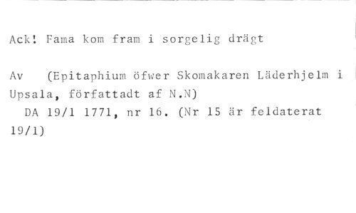 Ack! Fama kom fram i sorgelig drägt //// Av (Epitaphium öfwer Skomakaren Läderhjelm //// Upsala, författadt af N.N) //// DA 19/1 1771, nr 16. (Nr 15 är feldaterat 19/1)