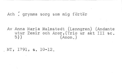 Ach : grymma sorg som mig förtär //// Av Anna Maria Malmstedt (Lenngren) (Andante utur Zemir och Azor,(Trio ur akt III sc. //// 5)) (Anon,) //// MT, 1791, s. 10-12.