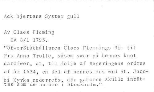 Ack hjertans Syster gull //// Av Claes Fleming //// DA 8/1 1793. //// "ÖfwerStåthållaren Claes Flemmings Rim til Fru Anna Trolle, såsom swar på hennes knot däröfwer, at, til följe af Regeringens ordres af år 1634, en del af hennes Hus wid St. Jaco- //// bi Kyrka nederrefs, där gatorne skulle inrättas som de nu äro i Stockholm."
