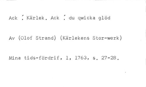 Ack . Kärlek. Ack : du qwicka glöd //// Av (Olof Strand) (Kärlekens Stor-werk) //// Mina tids-fördrif, 1, 1763, s. 27-28.