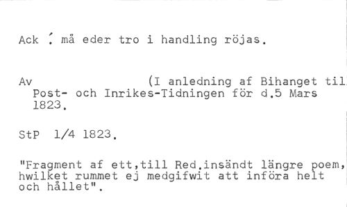 Ack : må eder tro i handling röjas. //// Av (I anledning af Bihanget tiL //// Post- och Inrikes-Tidningen för d.5 Mars 1823. //// StP 1/4 1823. //// "Fragment af ett,till Red.insändt längre poem,' hwilket rummet ej medgifwit att införa helt och hållet".