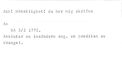 Ach: mänsklighet! du ber mig skrifwa //// Av //// DA 3/2 1772. //// Avslutar en insändare ang. en predikan av Wrangel.