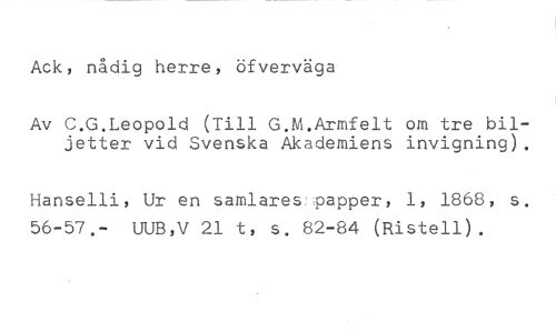 Ack, nådig herre, öfverväga //// Av C.G.Leopold (Till G.M.Armfelt om tre biljetter vid Svenska Akademiens invigning). //// Hanselli, Ur en samlares papper, 1, 1868, s. 56-57.- UUB,V 21 t, s. 82-84 (Ristell).