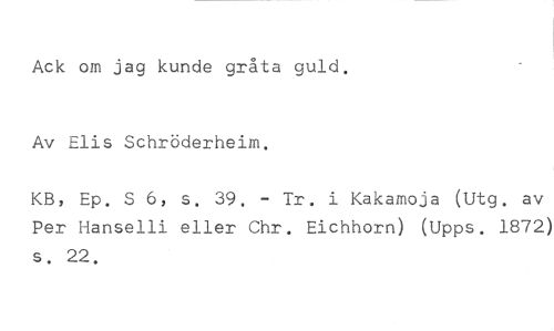 Ack om jag kunde gråta guld. //// Av Elis Schröderheim. //// KB, Ep. S 6, s. 39. - Tr. i Kakamoja (Utg. av Per Hanselli eller Chr. Eichhorn) (Upps. 1872) s. 22.