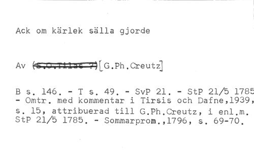 Ack om kärlek sälla gjorde //// Av 4;;;11501.0314349241G.Ph.CreutZ] //// B s. 146. - T s. 49. - SvP 21. - StP 21/5 1785 - Omtr. med kommentar i Tirsis och Dafne,1939, //// s. 15, attribuerad till G.Ph.Creutz, i enl.m. StP 21/5 1785. - Sommarprom.,1796, s. 69-70.