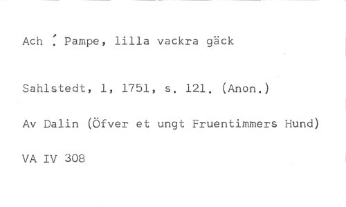 Ach Pampe, lilla vackra gäck //// Sahlstedt, 1, 1751, s. 121. (Anon.) //// Av Dalin (Öfver et ungt Fruentimmers Hund) VA IV 308