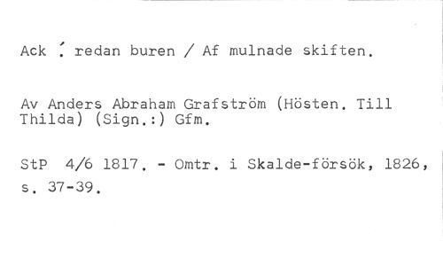 Ack : redan buren / Af mulnade skiften. //// Av Anders Abraham Grafström (Hösten. Till Thilda) (Sign.:) Gfm. //// StP 4/6 1817. - Omtr. i Skalde-försök, 1826, s. 37-39.