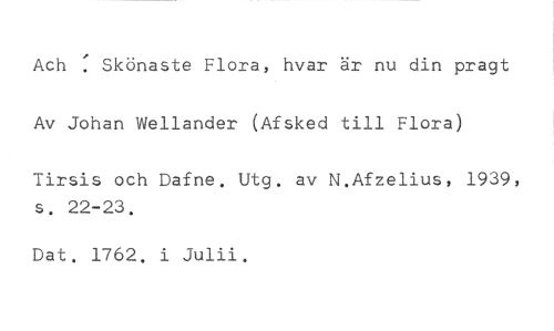 Ach : Skönaste Flora, hear är nu din pragt Av Johan Wellander (Afsked till Flora) //// Tirsis och Dafne. Utg. av N.Afzelius, 1939, s. 22-23. //// Dat. 1762. i Julii.