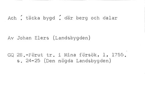 Ach : täcka bygd : där berg och dalar //// Av Johan Elers (Landsbygden) //// GQ 28.-Förut tr. i Mina försök, 1, 1755. s. 24-25 (Den nögda Landsbygden)
