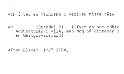 Ach : vad en människa i verlden måste tåla //// Av (Brandel ?) (Öfver en som sökte //// Adjuncturen i Våla, men dog på ditresan i en Gästgifvaregård) //// Afton-Bladet 16/7 1784.