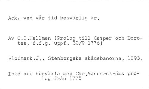 Ack, vad vår tid besvärlig är. //// Av C.I.Hallman (Prolog till Casper och Dorotea, f.f.g. uppf. 30/9 1776) //// Flodmark,J., Stenborgska skådebanorna, 1893. //// Icke att förväxla med ChrYanderströms prolog från 1775