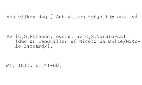 Ach vilken dag : Ach vilken fröjd för oss två //// Av (C.G.Etienne, övers. av C.G.Nordforss) //// (duo ur Cendrillon af Nicolo de Malte/Nicolo Isouard/). //// MT, 1811, s. 41-60.