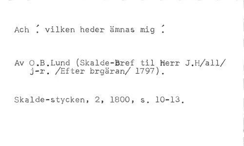 Ach : vilken heder ämnes mig //// Av O.B.Lund (Skalde-Bref til herr J.H/all/ j-r. /Efter brgäran/ 1797). //// Skalde-stycken, 2, 1800, s. 10-13.