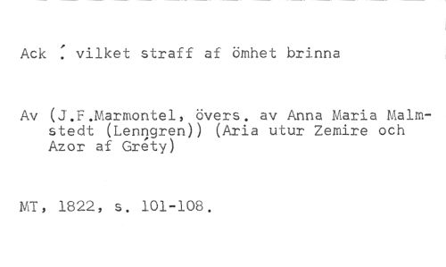 Ack : vilket straff af ömhet brinna //// Av (J.F.Marmontel, övers. av Anna Maria Malmstedt (Lenngren)) (Aria utur Zemire och Azor af Gr4ty) //// NGT, 1822, s. 101-108.