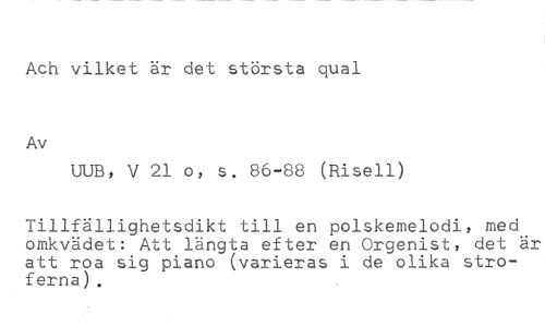 Ach vilket är det största quai //// Av //// UUB, V 21 o, s. 86-88 (Risell) //// Tillfällighetsdikt till en polskemelodi, med omkvädet: Att längta efter en Orgenist, det är att roa sig piano (varieras i de olika stroferna).
