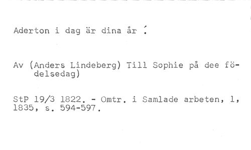 Aderton i dag är dina år //// Av (Anders Lindeberg) Till Sophie på dee födelsedag) //// StP 19/3 1822. - Omtr. i Samlade arbeten, 1, 1835, s. 594-597.