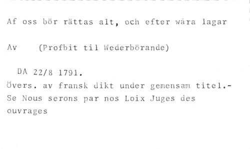 Af oss bör rättas alt, och efter våra lagar (Profbit til Wederbörande) //// DA 22/8 1791. //// Övers. av fransk dikt under gemensam titel.-Se Nous serons par nos Loix Juges des ouvrages