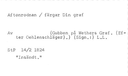 Aftonrodnan / färgar Din graf //// Av (Gubben på Wethers Graf. (Ef- //// ter Oehlenschläger).) (Sign.:) L.L. //// StP 14/2 1824 "Insändt."