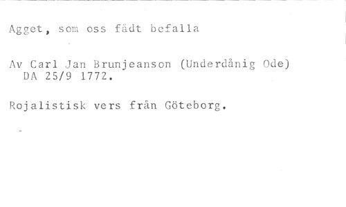 Agget, som oss fådt befalla //// Av Carl Jan Brunjeanson (Underdånig Ode) DA 25/9 1772. //// Rojalistisk vers från Göteborg.