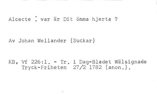 Alcecte : var är Dit ömma hjerta ? //// Av Johan Wellander (Suckar) //// KB, Vf 226:1. - Tr. i Dag-Bladet Wälsignade Tryck-Friheten 27/2 1782 (anon.).