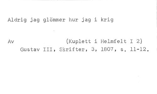 Aldrig jag glömmer hur jag i krig //// Av (Kuplett i Helmfelt 12) //// Gustav III, Skrifter, 3, 1807, s. 11-12.