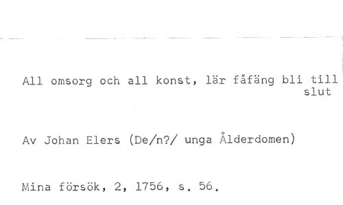 All omsorg och all konst, lär fåfäng bli till //// slut //// Av Johan Elers (De/n?/ unga Ålderdomen) //// Mina försök, 2, 1756, s. 56.