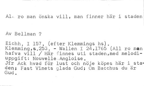 Al ro man önska vill, man finner här i staden Av Bellman ? //// Eichh. I 157. (efter Klemmings hs). //// Klemming,s.253. - Wallen I 24,1765 (All ro man hafva vill / Här finnes uti staden,med melodiuppgift: Nouvelle Angloise. //// Jfr Ack hvad för lust och nöje köpes här i staden; Fast Vinets glada Gud; Om Bacchus du är Gud.