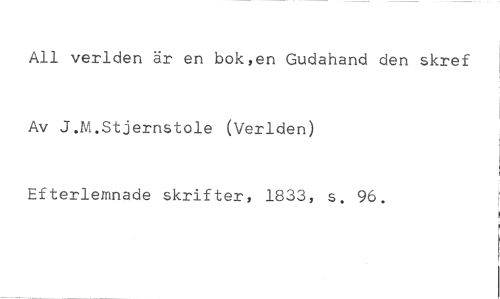 All verlden är en bok,en Gudahand den skref //// Av J.M.Stjernstole (Verlden) //// Efterlemnade skrifter, 1833, s. 96.