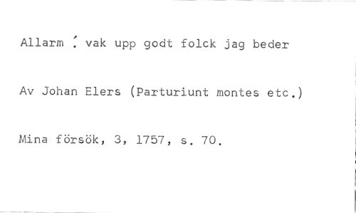 Allarm : vak upp godt folck jag beder //// Av Johan Elers (Parturiunt montes etc.) //// Mina försök, 3, 1757, s. 70.