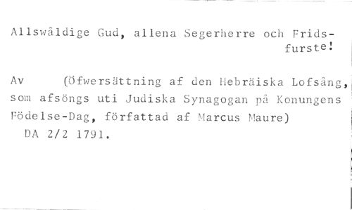 Allswåldige Gud, allena Segerherre och Frids- //// furste! //// Av (öfwersättning af den Hebräiska Lofsäng,, //// som afsöngs uti Judiska Synagogan på Konungens Födelse-Dag, författad af Marcus Maure) DA 2/2 1791.